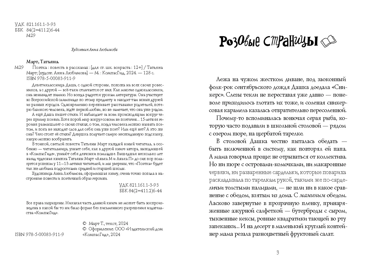 В тонкой, светлой повести Татьяны Март каждый юный читатель, а особенно — читательница, узнает себя, как в другой книге автора, выходившей в «КомпасГиде», узнают себя девчонки помладше. Вышедшая несколько лет назад чудесная книжка Татьяны Март «Анька М и Анька П» до сих пор пользуется успехом у 11–13‑летних читателей, и мы уверены, что «Поэтка» будет так же любима подростками средней и старшей школы.