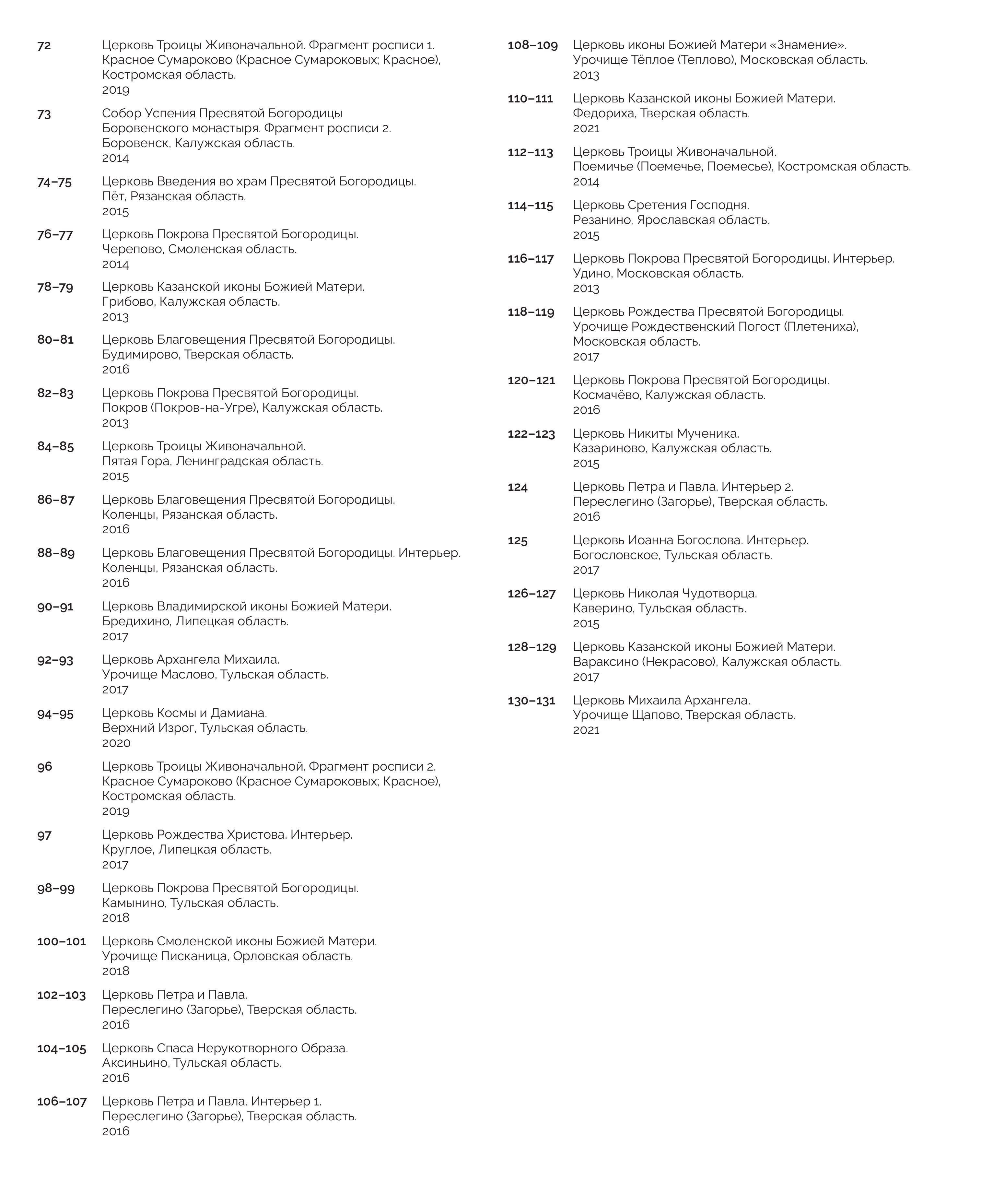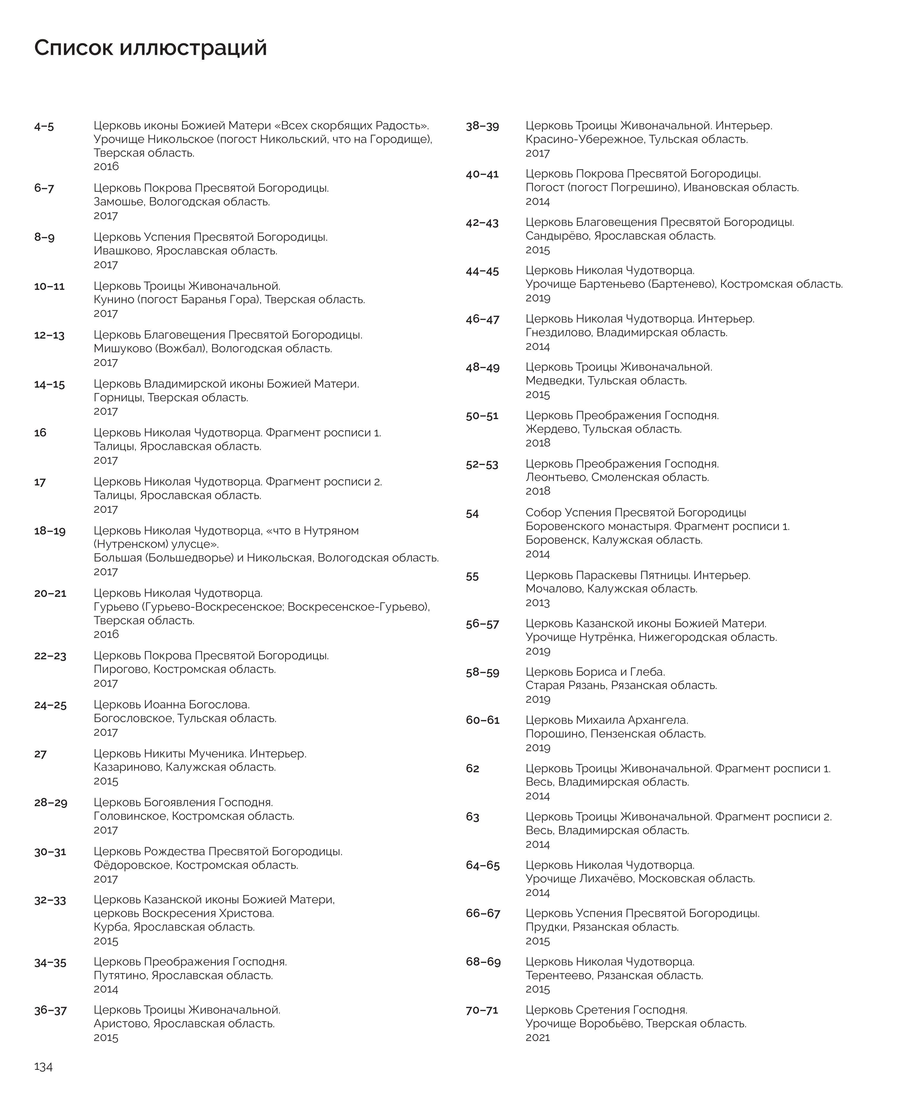 В книгу вошли фотографии, сделанные во Владимирской, Вологодской, Ивановской, Калужской, Костромской, Ленинградской, Липецкой, Московской, Орловской, Пензенской, Рязанской, Смоленской, Тверской, Тульской и Ярославской областях России. Издание адресовано как специалистам в области архитектуры и сохранения материального наследия, так и широкому кругу читателей.