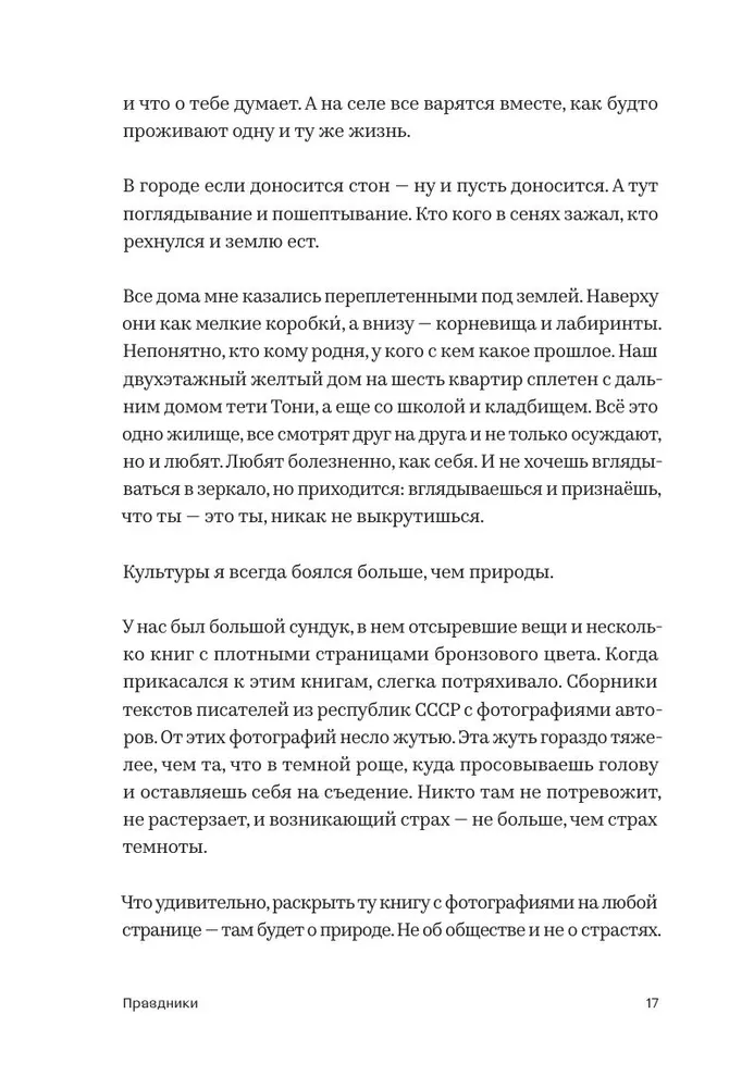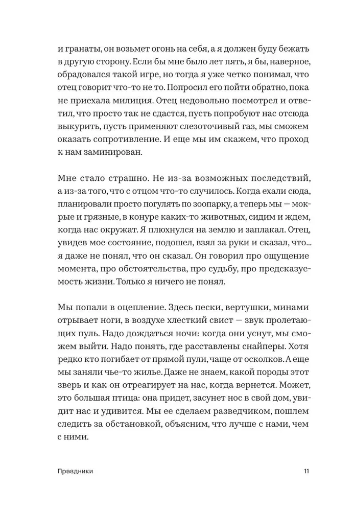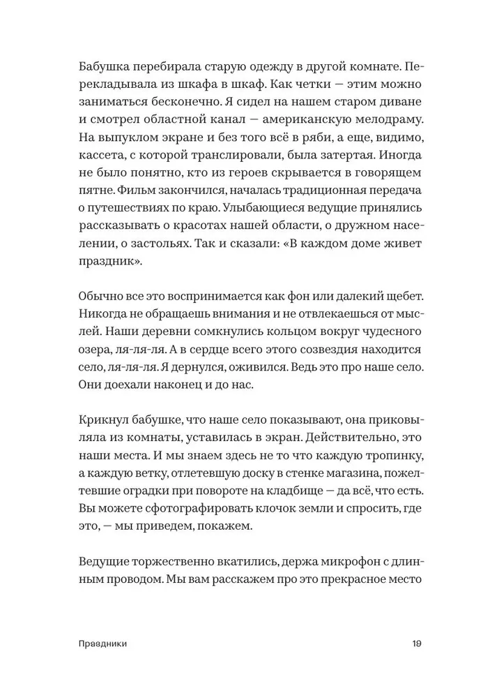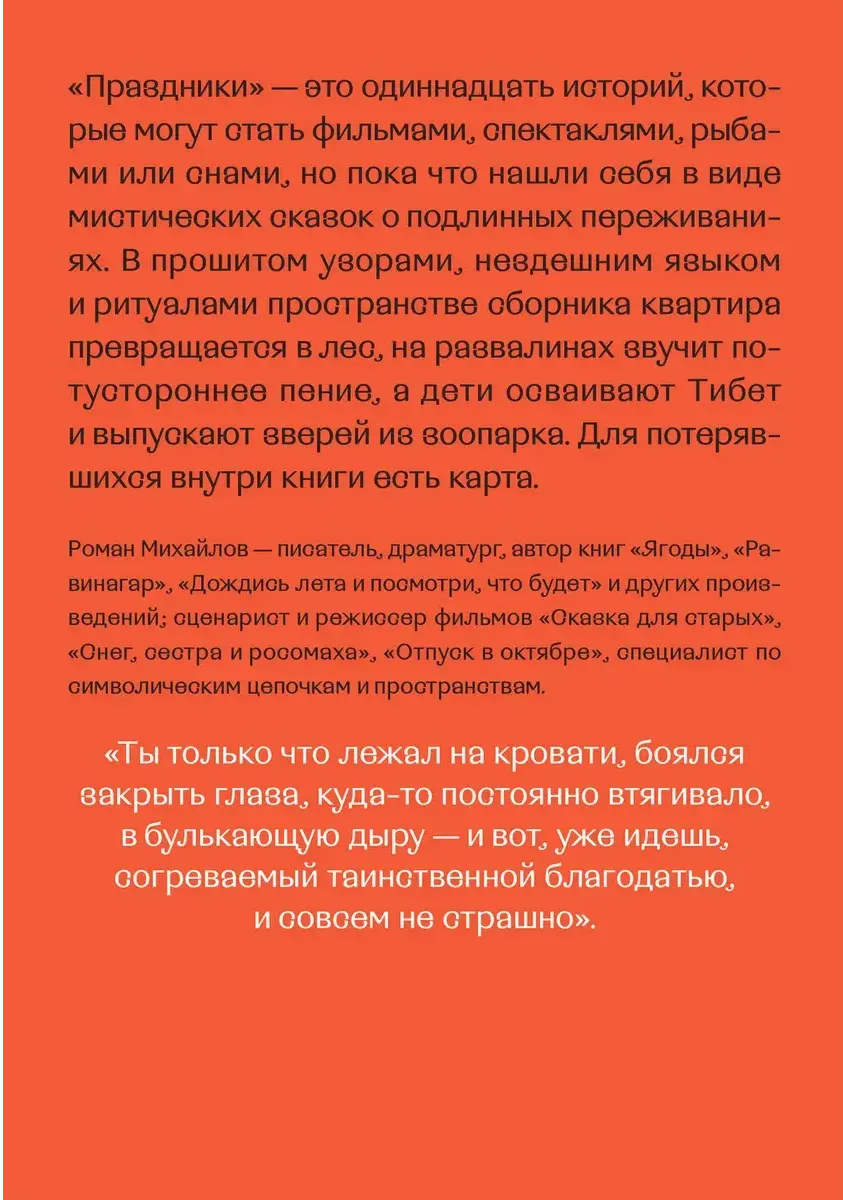 «Праздники» — это одиннадцать историй, которые могут стать фильмами, спектаклями, рыбами или снами, но пока что нашли себя в виде мистических сказок о подлинных переживаниях. В прошитом узорами, нездешним языком и ритуалами пространстве сборника квартира превращается в лес, на развалинах храма звучит потустороннее пение, а дети осваивают Тибет и выпускают зверей из зоопарка. Для потерявшихся внутри книги есть карта.