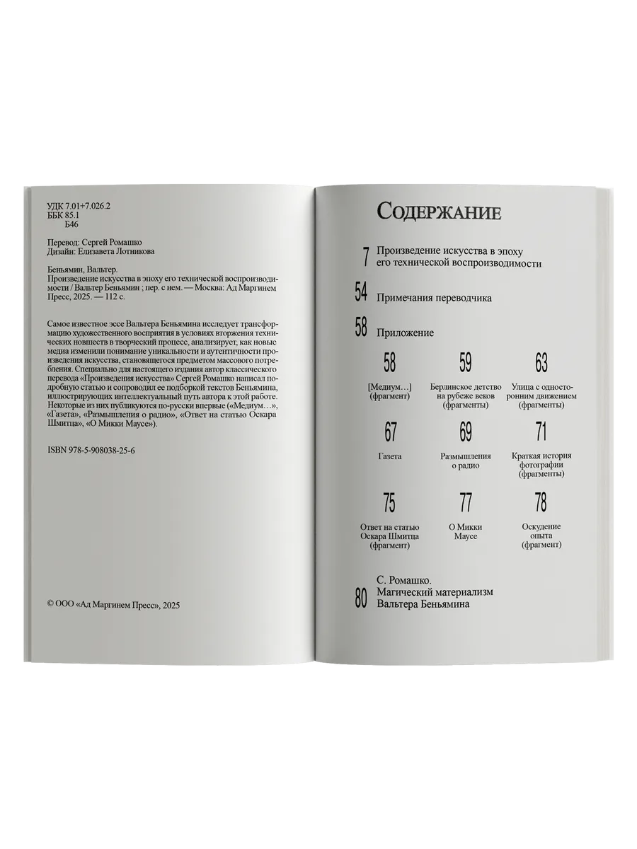Самое известное эссе Вальтера Беньямина исследует трансформацию художественного восприятия в условиях вторжения технических новшеств в творческий процесс, анализирует, как новые медиа изменили понимание уникальности и аутентичности произведения искусства, становящегося предметом массового потребления. Специально для настоящего издания автор классического перевода «Произведения искусства» Сергей Ромашко написал подробную статью и сопроводил ее подборкой текстов Беньямина, иллюстрирующих интеллектуальный путь автора к этой работе. Некоторые из них публикуются по-русски впервые («Медиум…», «Газета», «Размышления о радио», «Ответ на статью Оскара Шмитца», «О Микки Маусе»).
