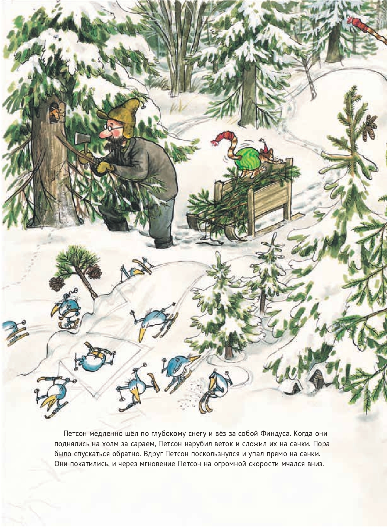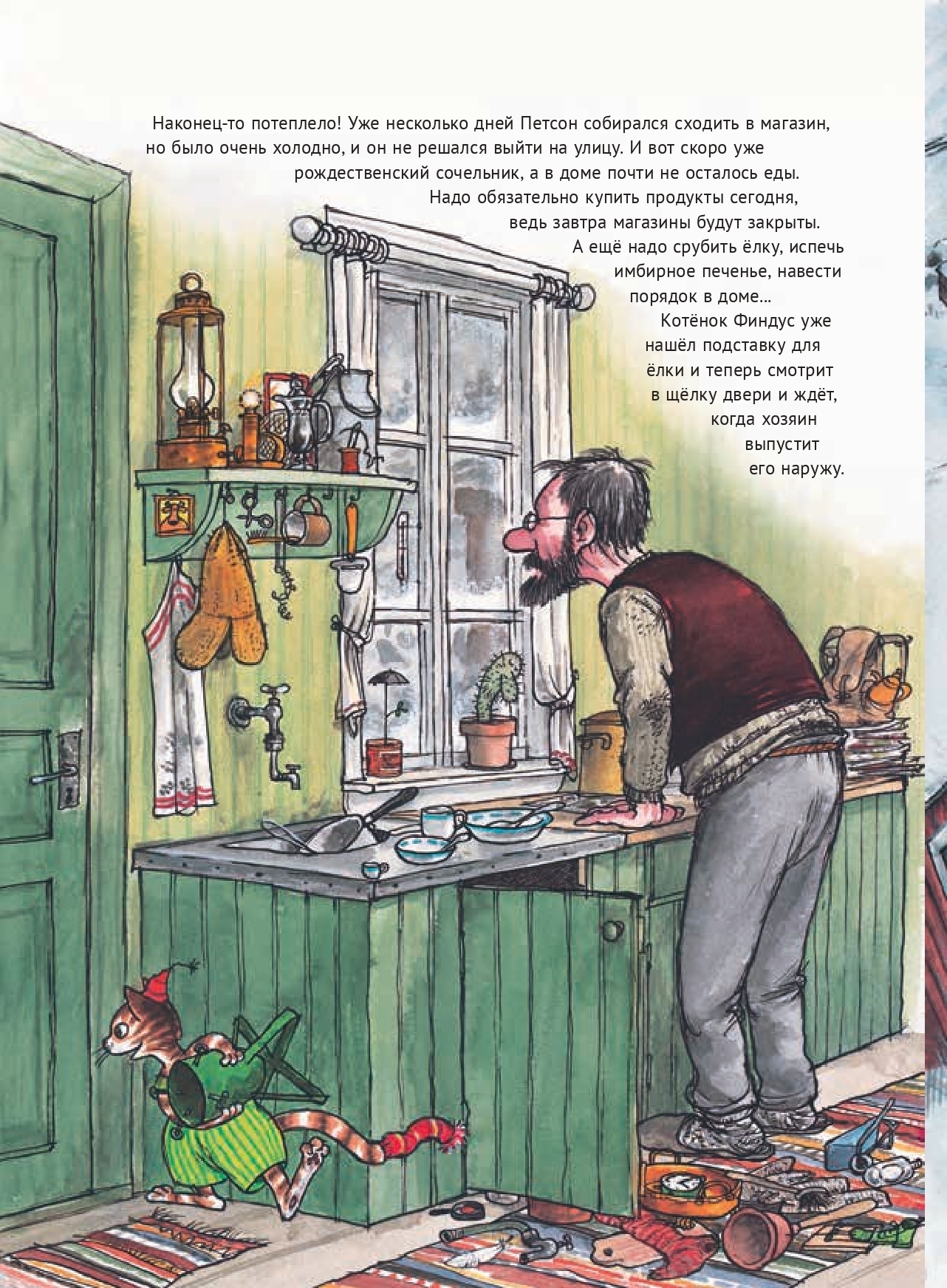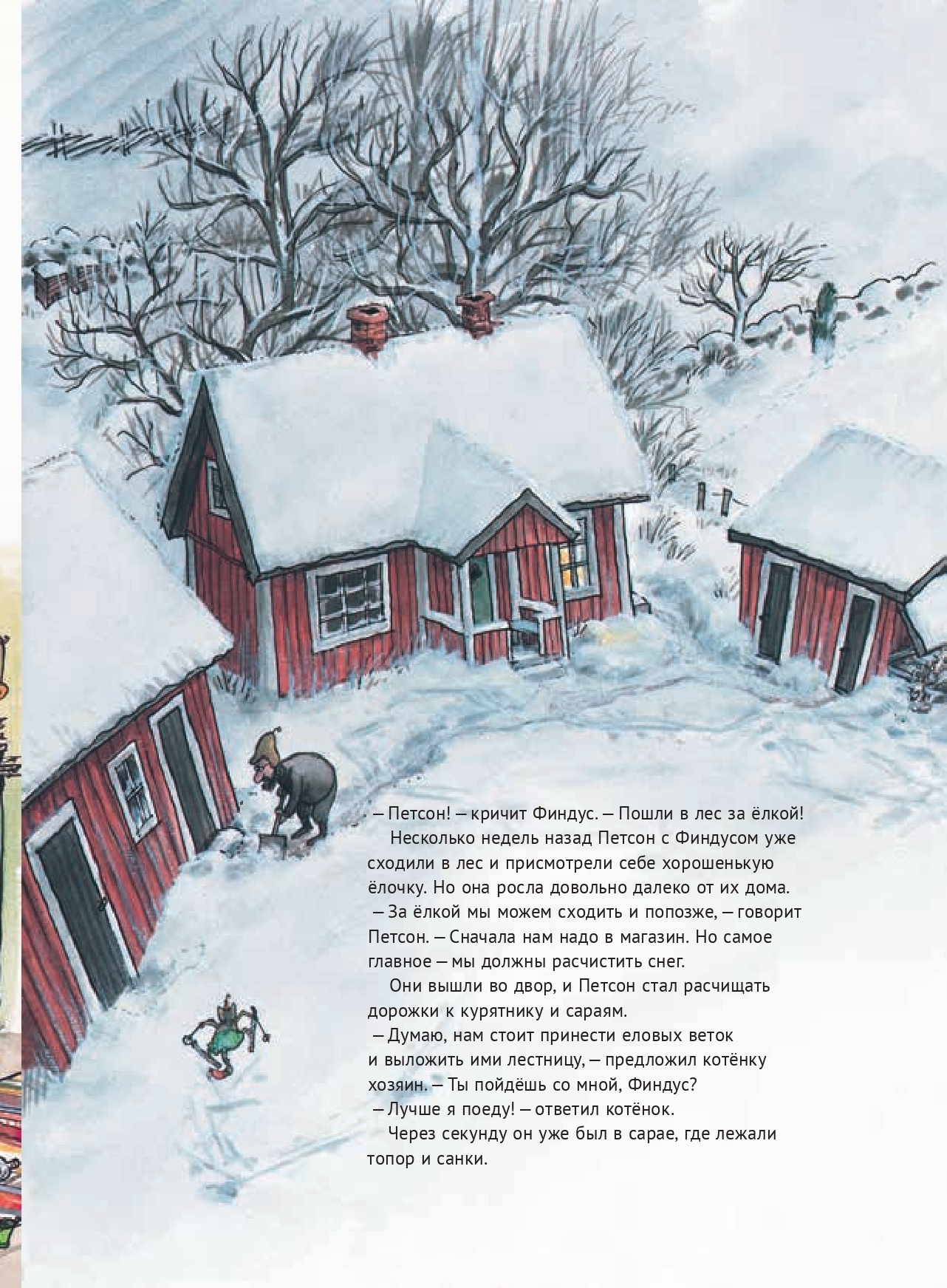 Близится Рождество, а у Петсона еще ничего не готово к празднику. Надо успеть сходить в магазин, пока он не закрылся, а еще нужно нарубить дров и принести из леса елку. Но в лесу Петсон подворачивает ногу — и ходить больше не может. Его котенок Финдус в ужасе и расстройстве: Рождество и Новый год без елки, без угощения без подарков? Как такое может быть? Но о беде, случившейся с Петсоном, узнали соседи. И вот кто-то ему нарубил целый сарай дров, кто-то принес ветчины, а кто-то помог Финдусу нарядить елку. Удивительное Рождество получилось у Петсона с Финдусом в этом году!