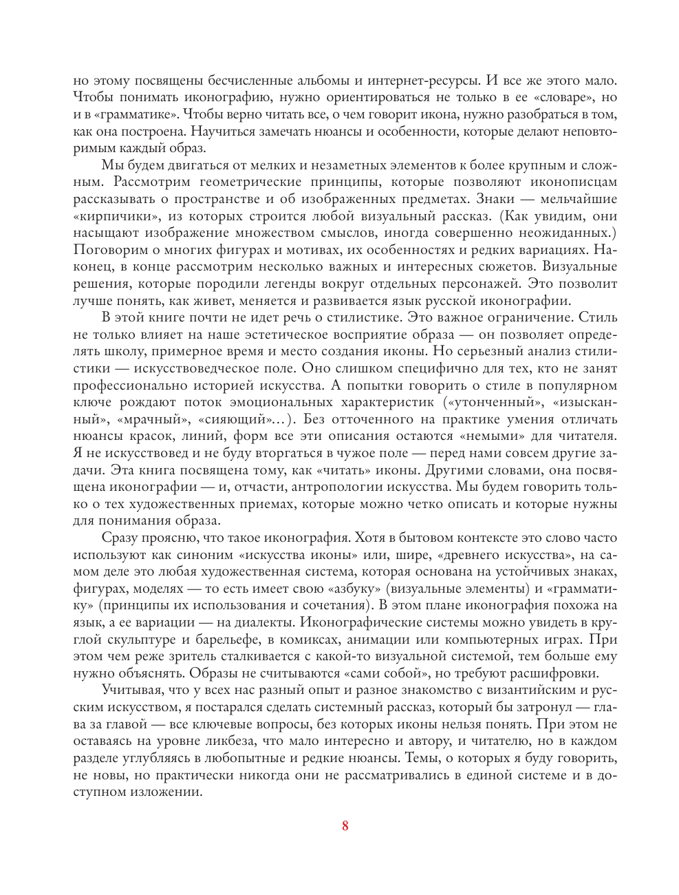 Перед вами не обычная энциклопедия по русской иконописи. Главная цель этой книги — дать читателям ключи, которые позволят ориентироваться в мире икон и настенных росписей. Понимать логику изображений и видеть информацию, скрытую в деталях. Автор шаг за шагом показывает, как можно «читать» иконы и как разбираться в интересных нюансах, скрывающихся в каждом сюжете.