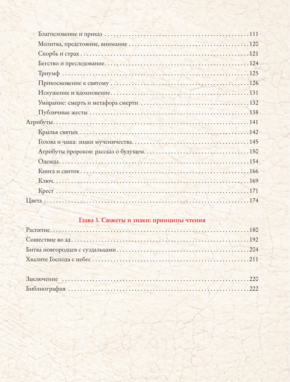 В первой главе описаны геометрические принципы, которые позволяют иконописцам рассказывать о пространстве и об изображаемых предметах. В следующих главах речь идет о знаках — малозаметных элементах, из которых строится любой визуальный рассказ, и о мотивах, повторяющихся в разных композициях. Наконец, в последней главе автор рассматривает необычные вариации некоторых сюжетов.