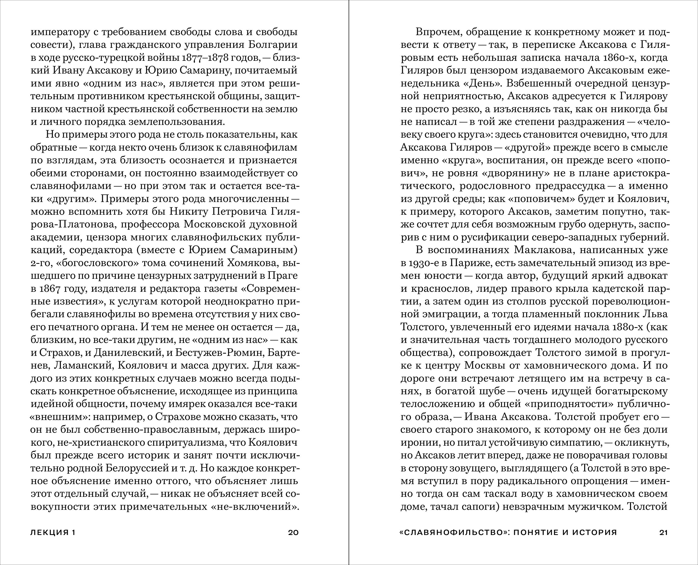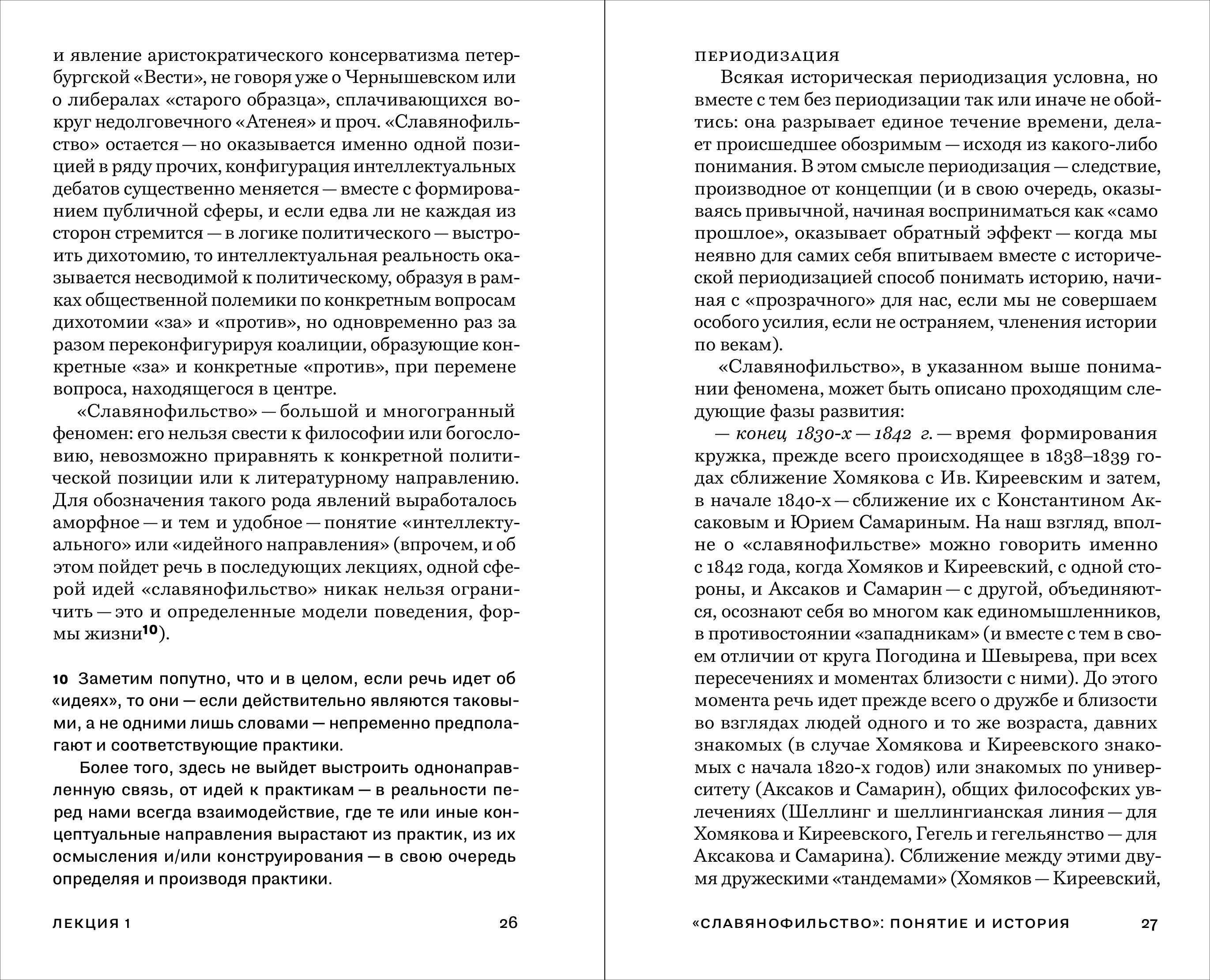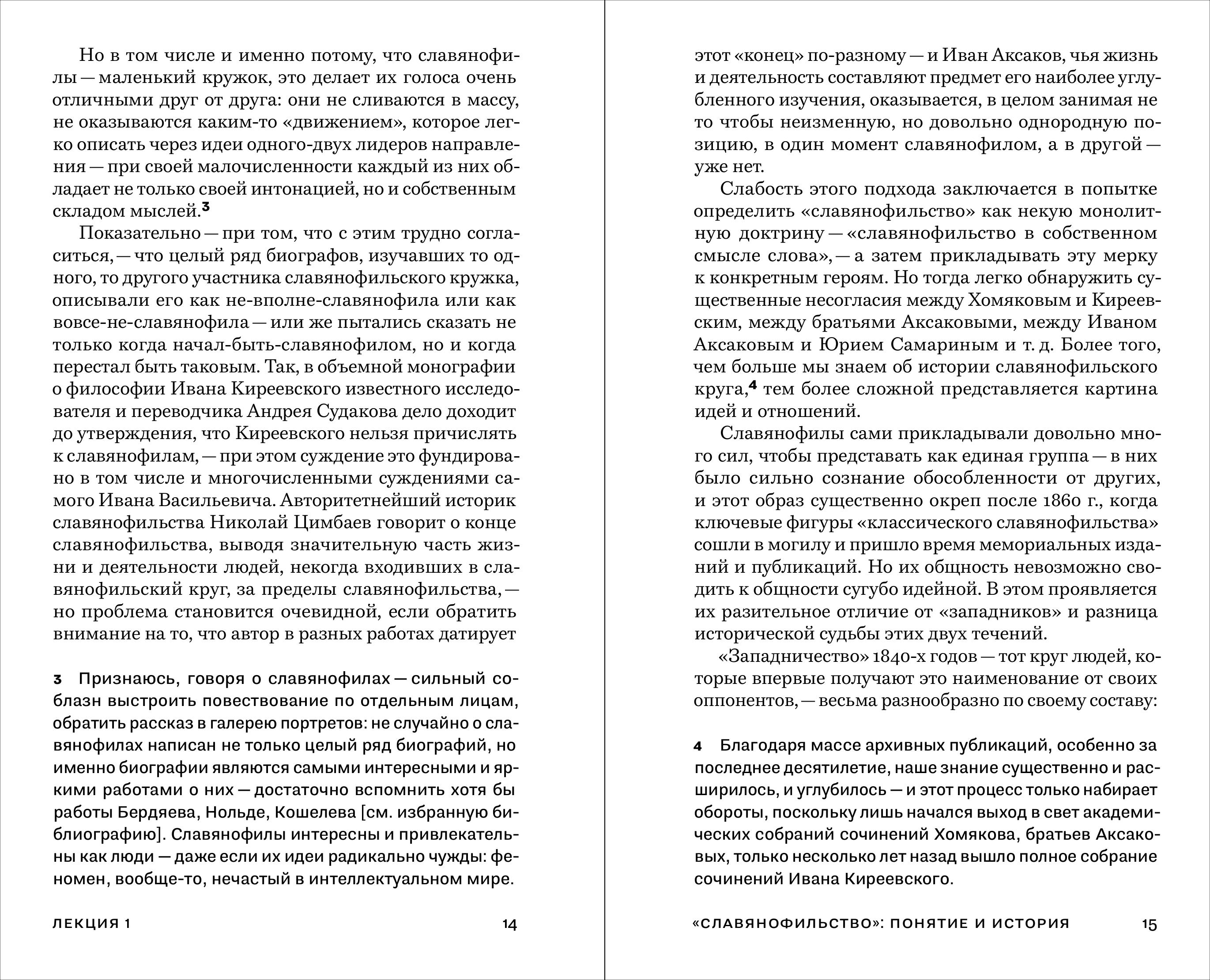 «Славянофилы, прежде всего, — маленький кружок людей. У Ключевского в «Записных книжках», кажется, в пору его работы над материалами к биографии кн. Черкасского, есть заметка – что все славянофилы легко поместились бы на одном диване. … Но в том числе и именно потому, что славянофилы – маленький кружок, это делает их голоса очень отличными друг от друга: они не сливаются в массу, не оказываются каким-то «движением», которое легко описать через идеи одного-двух лидеров направления – при своей малочисленности каждый из них обладает не только своей интонацией, но и собственным складом мыслей».