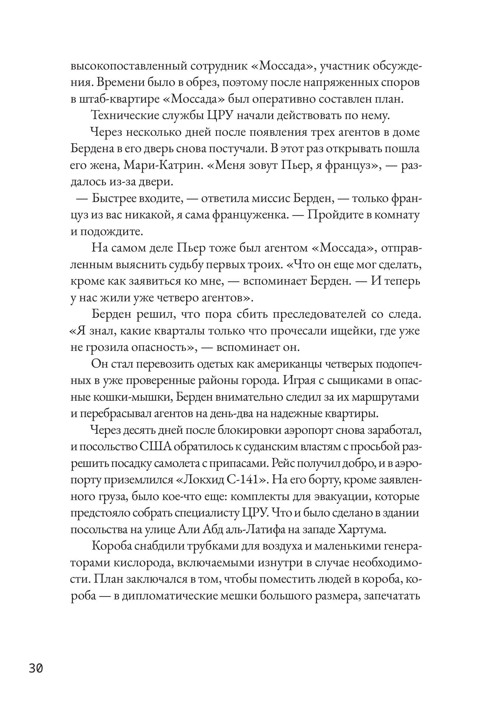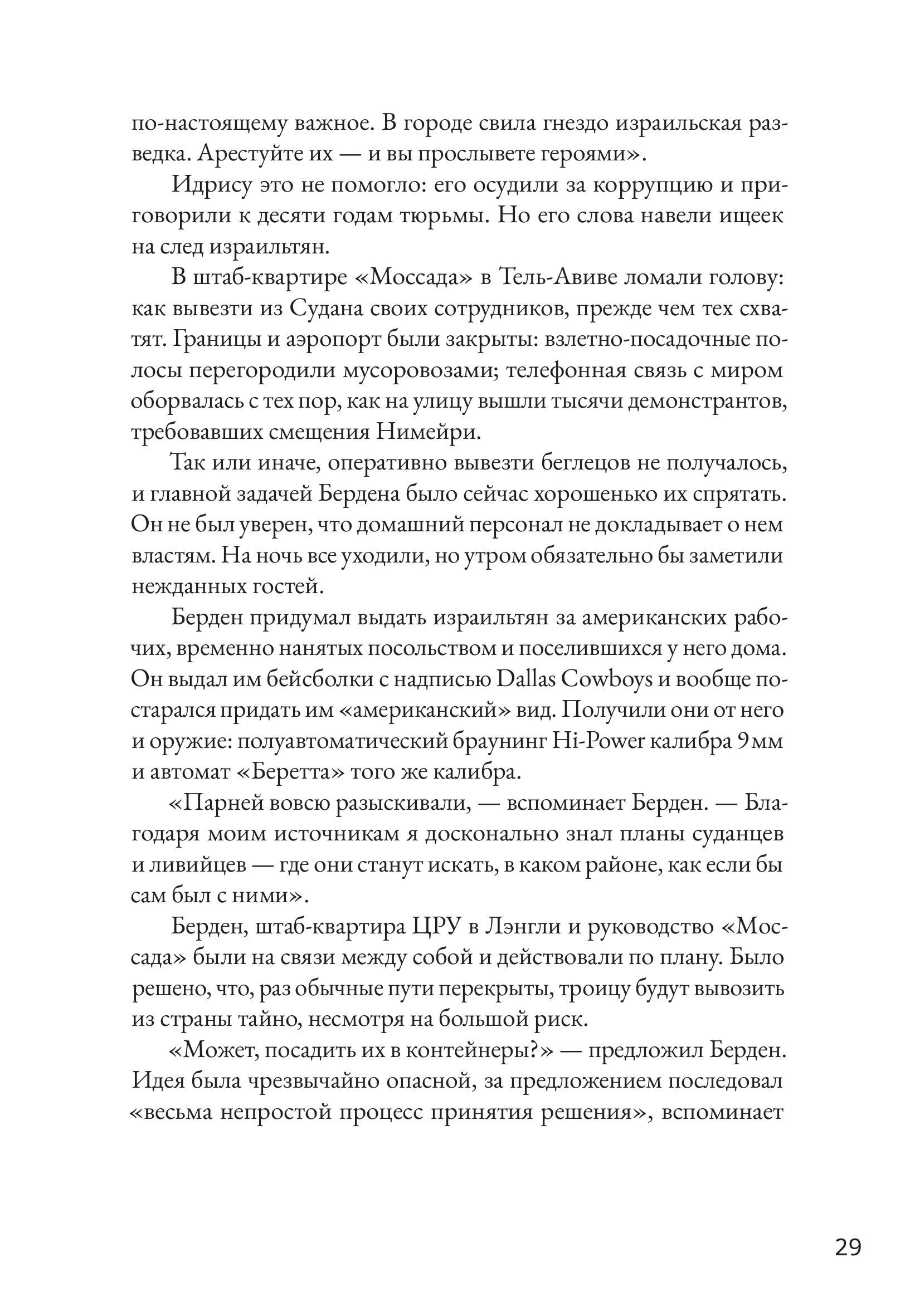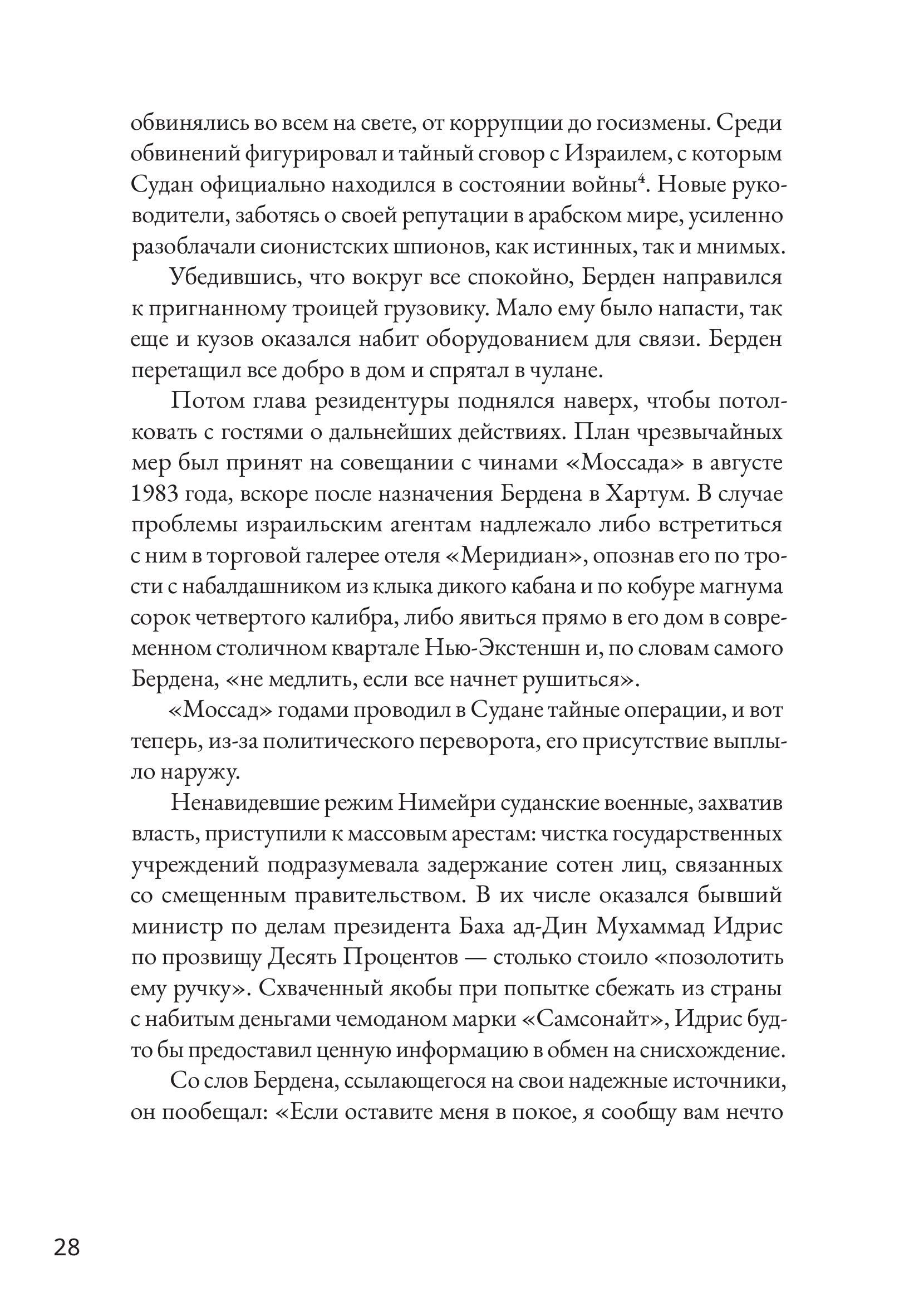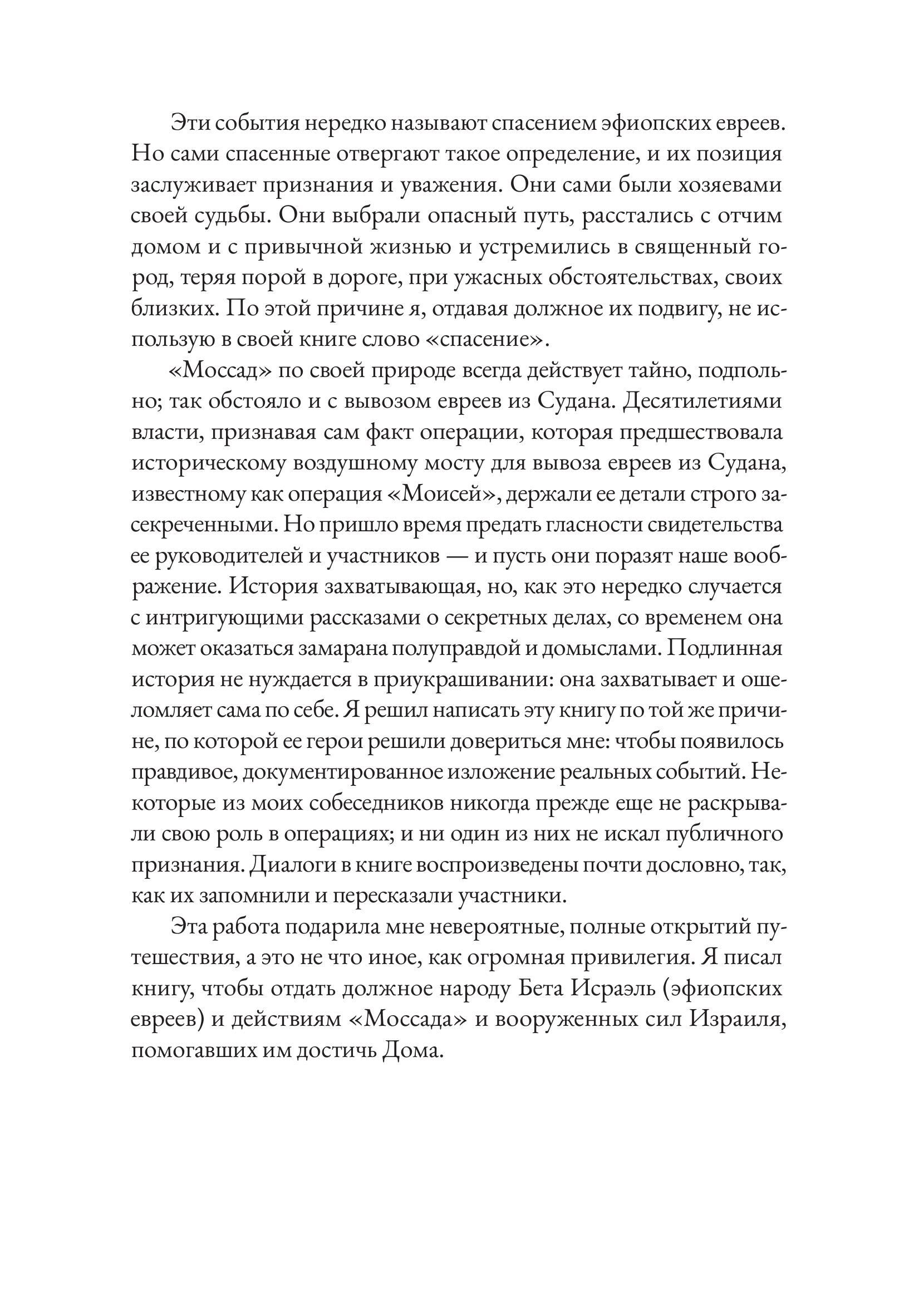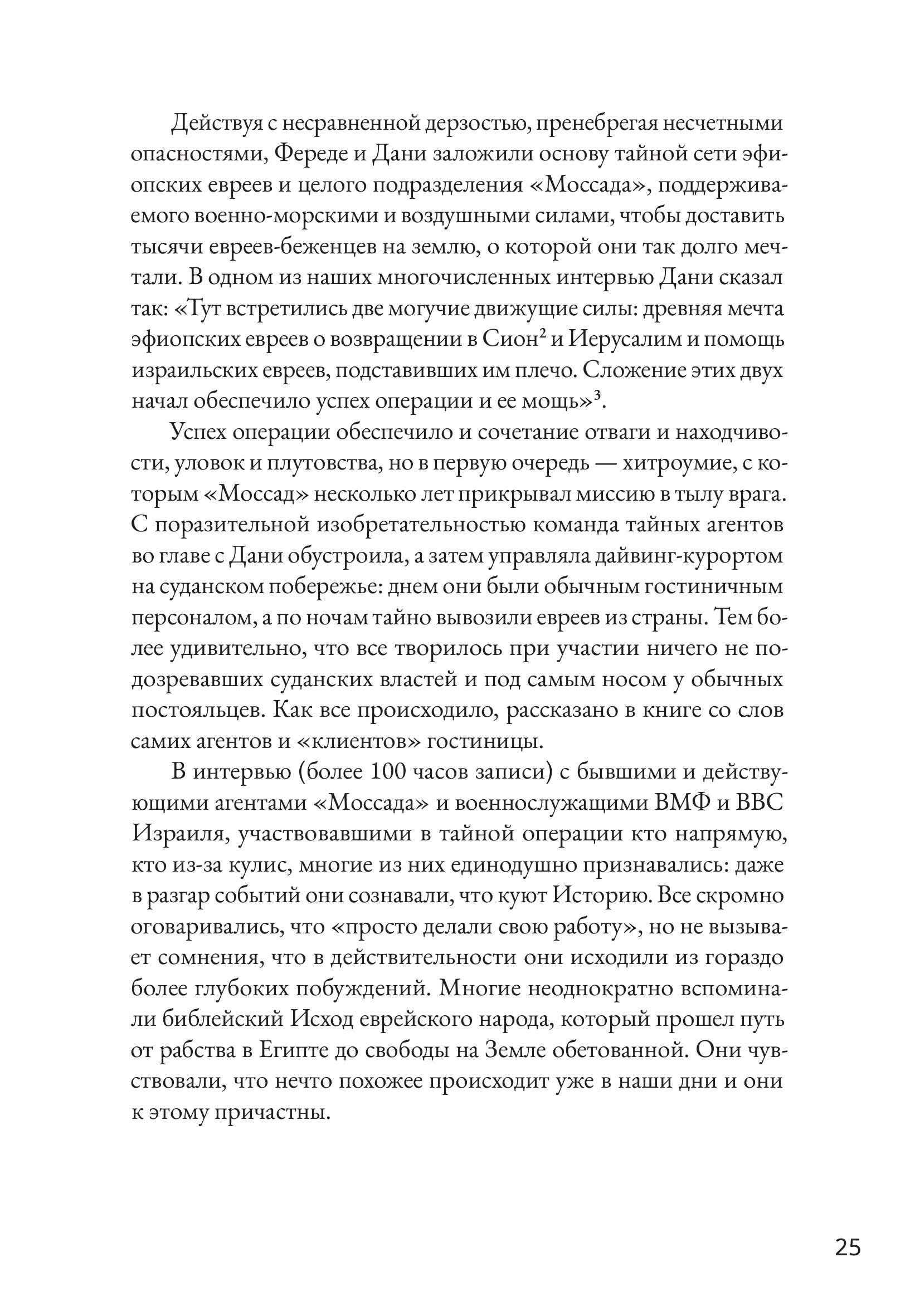 В начале 1980-х годов на суданском побережье Красного моря открылся дайвинг-курорт, организованный некими европейскими бизнесменами при полном одобрении и поддержке суданских властей. И ни чиновникам, ни гостям курорта было невдомек, что поселок — база тайных агентов «Моссада», израильской спецслужбы. Днем тут развлекали туристов, а под покровом ночи отправляли сотни эфиопских евреев в Израиль. Курорт Арус стал частью широкомасштабной операции с участием ВМФ и ВВС Израиля. Постоянно рискуя свободой и жизнью, агенты действовали под носом у суданской полиции, армии и бдительных граждан. Но задача переправить «потерянное колено» была важнее, чем риск. Британский журналист Раффи Берг провел огромную работу, чтобы установить подробности этой невероятной истории, долгое время запечатанной грифом «секретно». В этом ему помогали сами участники событий. Его книга — одновременно захватывающий детектив, приключенческий роман и политический триллер.