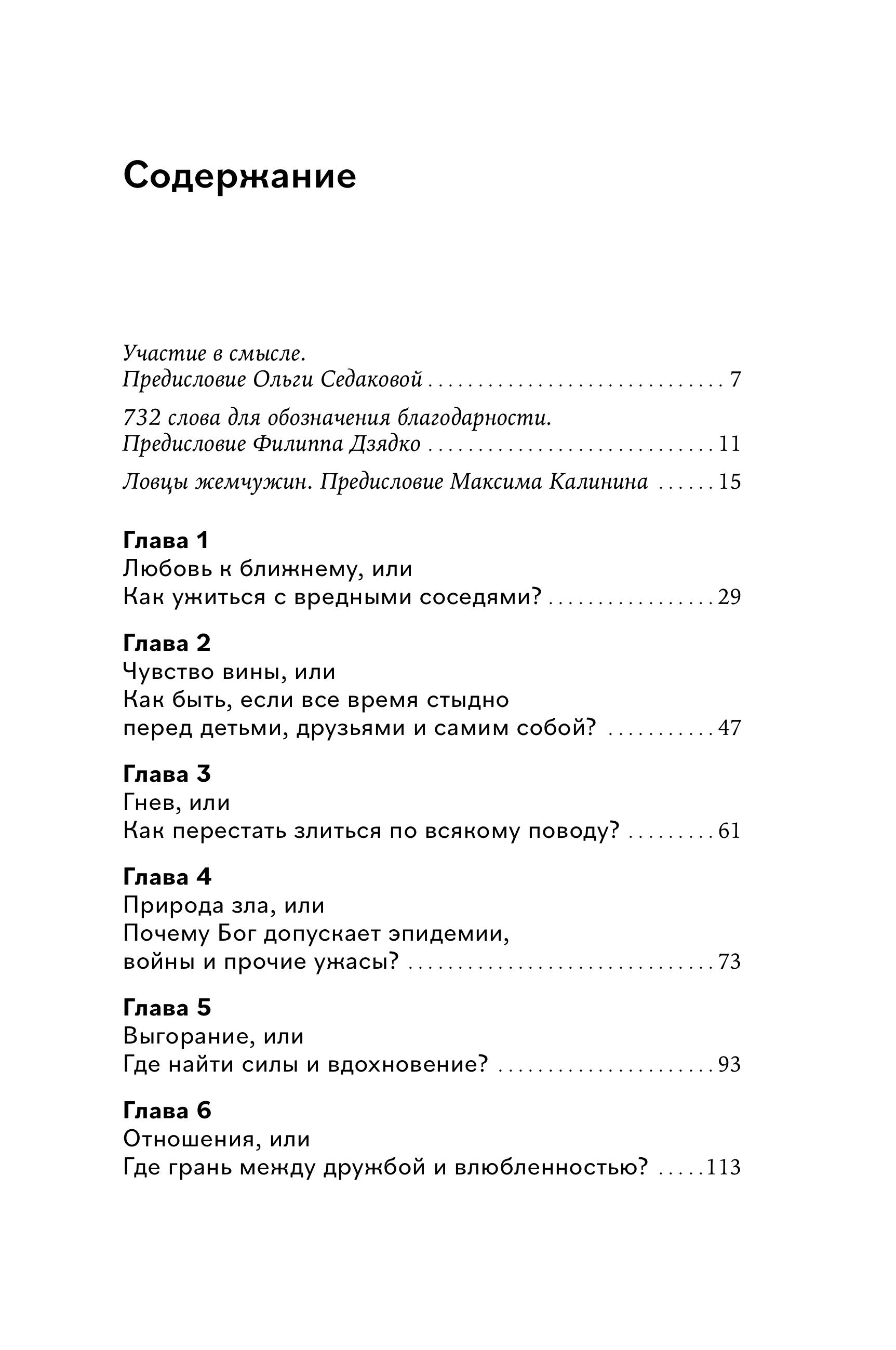 Книга построена в форме диалога и разделена на главы, в которых рассмотрены такие важные темы, как природа зла, любовь к ближнему, чувство вины, выгорание, критика, страх, успех, радость.