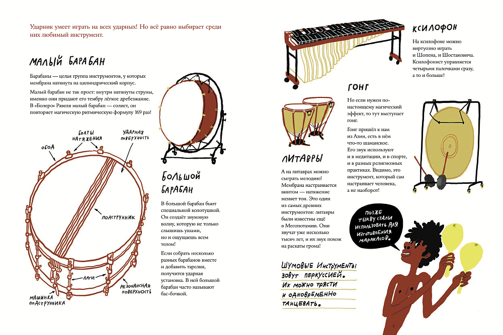 Музыка была уже в жизни неандертальцев. Человек сначала запел и только потом заговорил. Книга рассказывает историю ударных, духовых, струнных и клавишных инструментов, как они были придуманы, как менялись со временем. Читатель сможет понять, как устроен оркестр, выяснить, какую роль в нём играет каждый инструмент, и, может быть, выбрать, инструмент по душе. Музыка — язык, на котором говорит весь мир. Инструменты спорят, сердятся, радуются, смеются, дразнят, уговаривают, жалуются и успокаивают. И, что бы с нами ни происходило, мы всегда сможем понять друг друга через музыку.