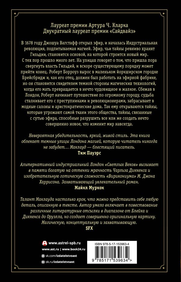 В 1678 году Джошуа Вагстафф открыл эфир, и началась Индустриальная революция, подпитываемая магией. Эфир, чьи тайны ревниво хранят Гильдии, становится клеем, который скрепляет новое общество. С тех пор прошло много лет, и в воздухе зреют перемены. На улицах говорят о новом начале, о том, что пришла пора свергнуть власть Гильдий, и вскоре существующему миропорядку может прийти конец… Роберт Борроуз вырос в маленьком йоркширском городке Брейсбридж и, как его отец, должен был работать на эфирной фабрике, но он становится свидетелем темной стороны магической технологии, когда его мать превращается в нечто чудовищное и жалкое. Сбежав в Лондон, Роберт начинает свое путешествие по огромному городу, судьба сталкивает его с мелкими преступниками и революционерами, забрасывает в модные салоны и аристократические дома. Так ему открываются тайны, которые угрожают самой ткани этого общества, тайны, связанные с сутью эфира, способные разрушить все или же создать нечто совершенно новое, что изменит мир навсегда.