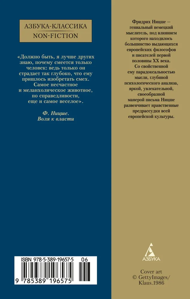 Фридрих Ницше — гениальный немецкий мыслитель, под влиянием которого находилось большинство выдающихся европейских философов и писателей первой половины ХХ века. Со свойственной ему парадоксальностью мысли, глубиной психологического анализа, яркой, увлекательной, своеобразной манерой письма Ницше развенчивает нравственные предрассудки всей европейской культуры.