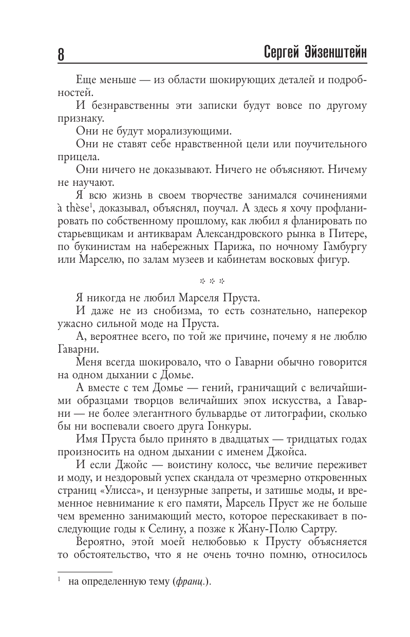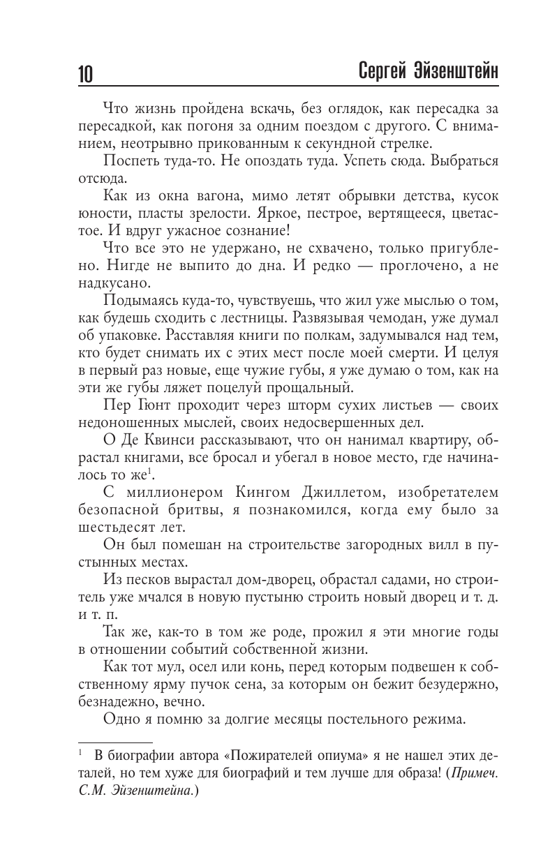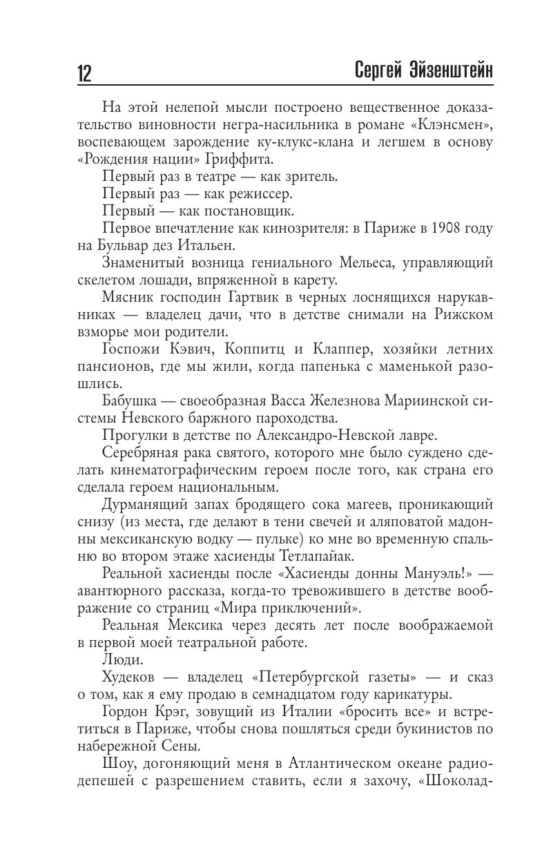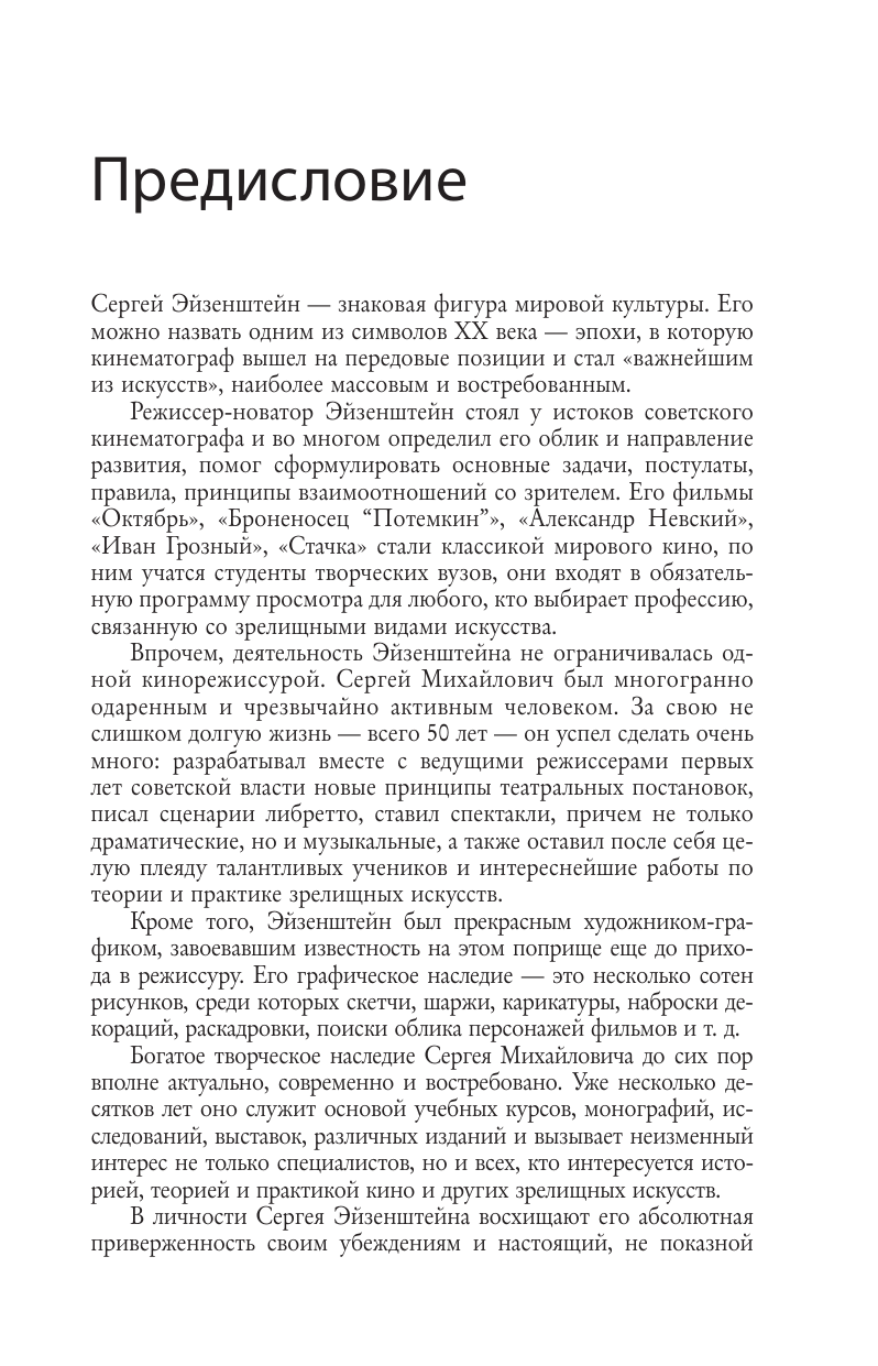 В этой книге собраны эссе и статьи Сергея Михайловича, его воспоминания о детстве, пути в режиссуру, работе над фильмами, об интересных людях, а также теоретические и публицистические работы. Тексты проиллюстрированы его рисунками, созданными в 1920-1940-х годах.
