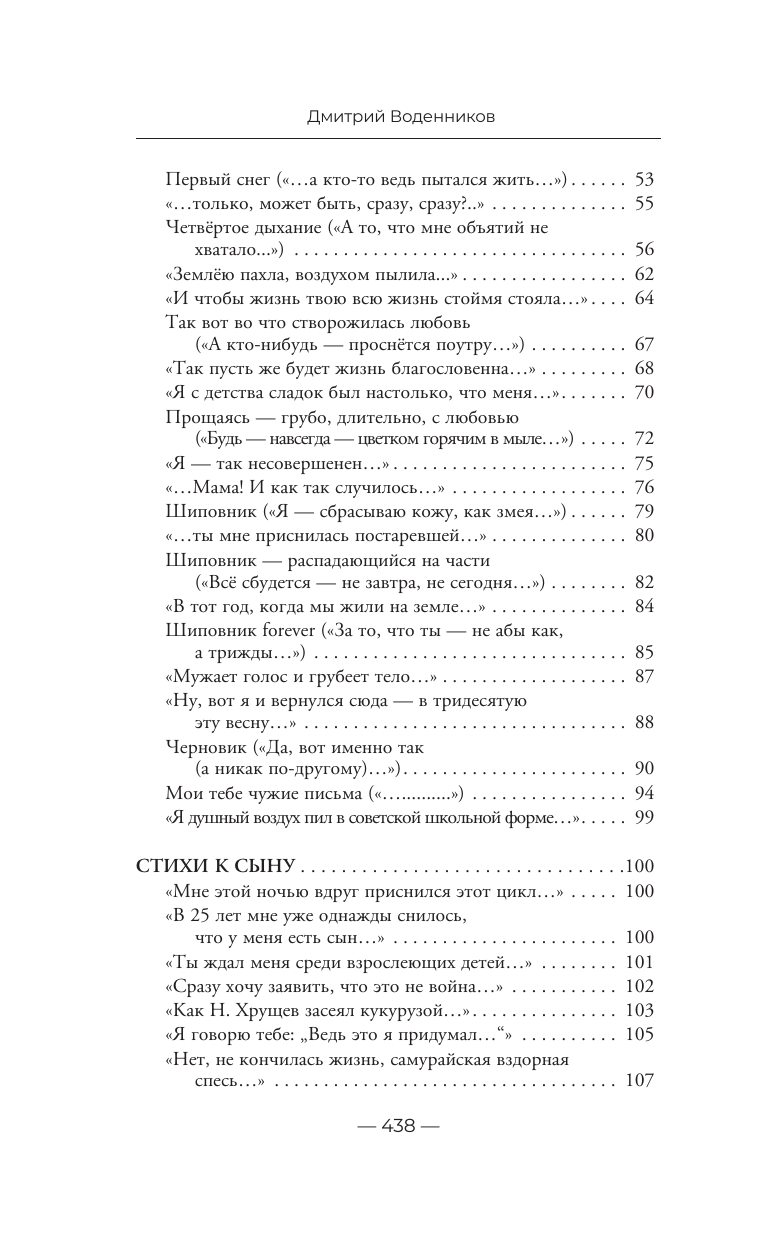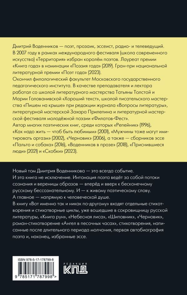 Новый том Дмитрия Воденникова — это всегда событие. И эта книга не исключение. Отдельные стихотворения и стихотворные циклы, уже вошедшие в сокровищницу русской литературы: «Книга рун», «Небесная лиса», «Шиповник», «Черновик», роман-стихотворение «Ангел в песочных часах», стихотворения, написанные после длительного периода молчания, и наконец избранные эссе — всем этим предстоит насладиться тебе, дорогой читатель. Интонация поэта ведёт за собой потоки сознания и вереницы образов — вперёд и вверх к бесконечному русскому бессознательному. И — к живому поэтическому слову. А главное — напрямую к человеческой душе. Вот именно так и никак по-другому.