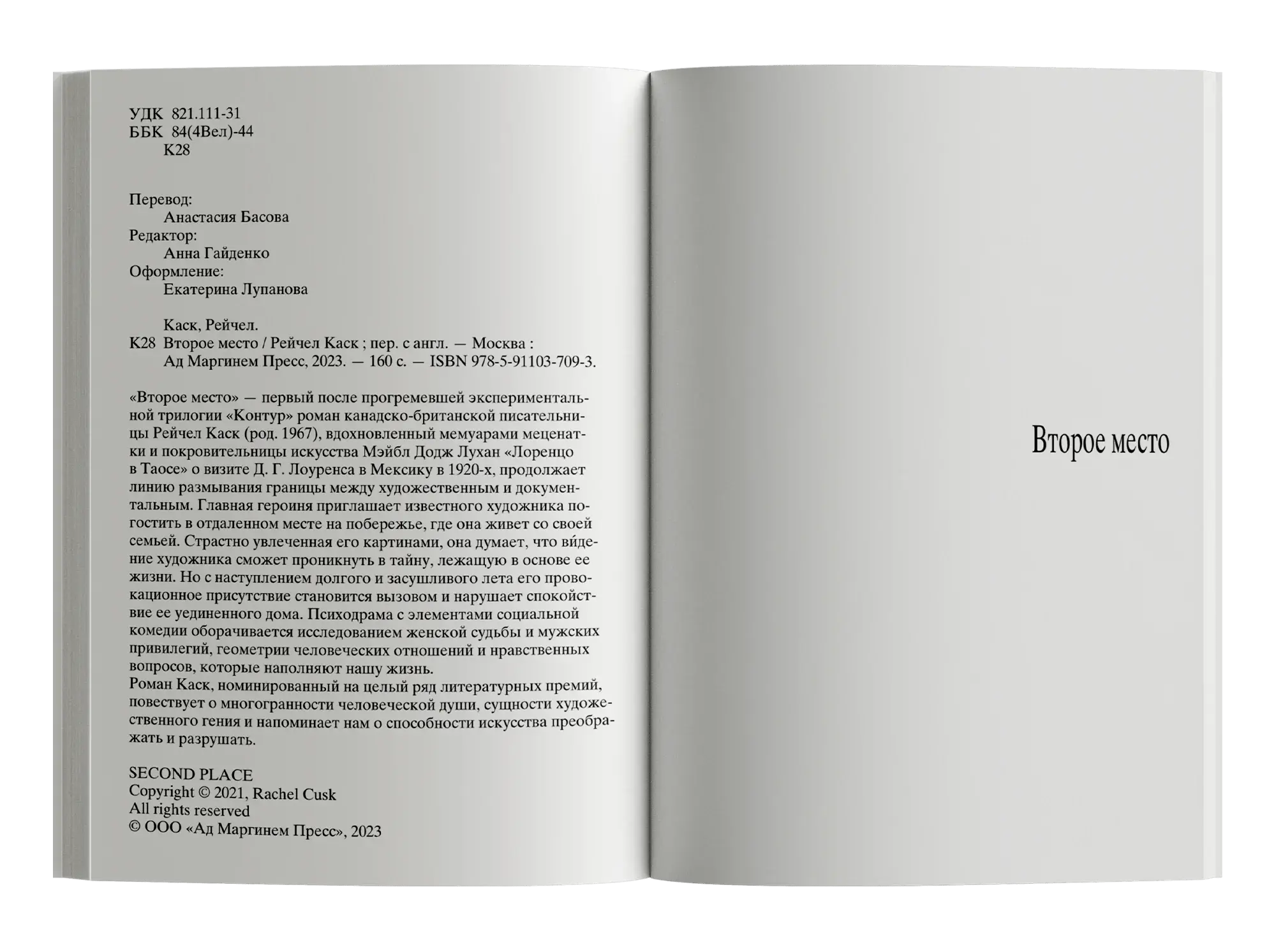 «Второе место» — первый после прогремевшей экспериментальной трилогии «Контур» роман канадско-британской писательницы Рейчел Каск (род. 1967), вдохновленный мемуарами меценатки и покровительницы искусства Мэйбл Додж Лухан «Лоренцо в Таосе» о визите Д. Г. Лоуренса в Мексику в 1920-х, продолжает линию размывания границы между художественным и документальным. Главная героиня приглашает известного художника погостить в отдаленном месте на побережье, где она живет со своей семьей. Страстно увлеченная его картинами, она думает, что ви́дение художника сможет проникнуть в тайну, лежащую в основе ее жизни. Но с наступлением долгого и засушливого лета его провокационное присутствие становится вызовом и нарушает спокойствие ее уединенного дома. Психодрама с элементами социальной комедии оборачивается исследованием женской судьбы и мужских привилегий, геометрии человеческих отношений и нравственных вопросов, которые наполняют нашу жизнь.