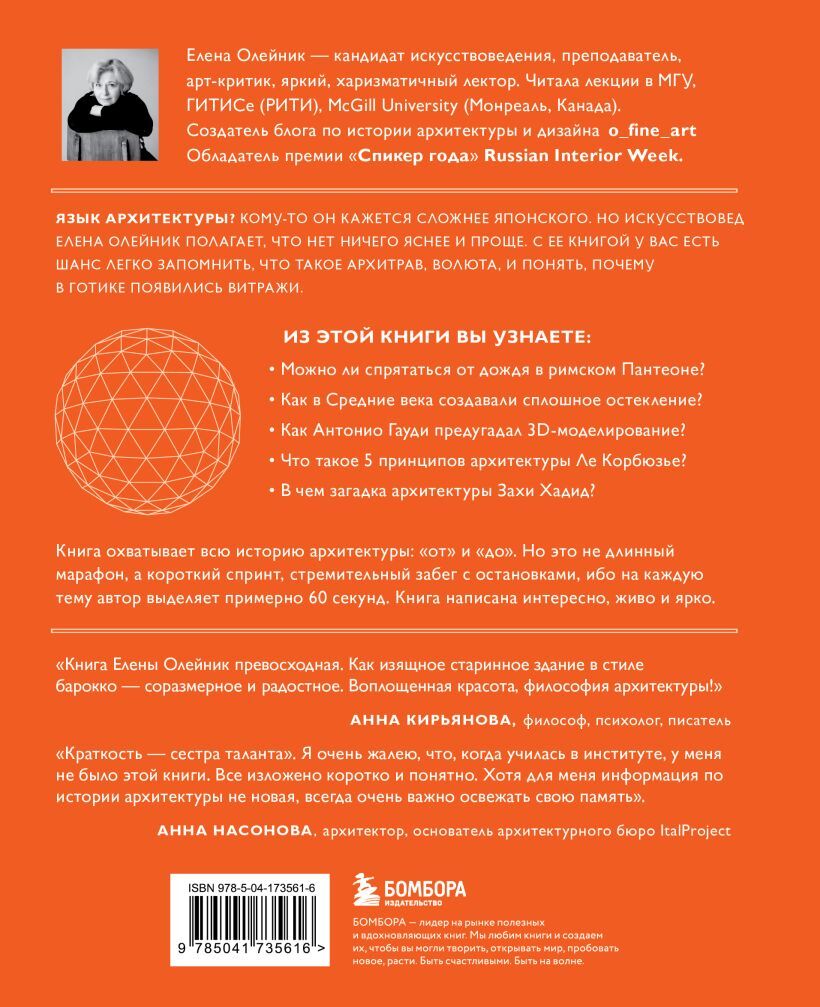 Понять архитектуру теперь стало еще проще: автор книги Елена Олейник, кандидат искусствоведения, преподаватель, арт-критик, яркий харизматичный лектор и обладатель премии «Спикер года» Russian Interior Week 2024, благодаря подробно структурированной информации поможет разобраться не только в стилях, направлениях и терминах, но и в том, как благодаря разнообразию архитектурных решений можно ближе познакомиться с разными периодами нашей истории. Богато иллюстрированное издание позволит глубже погрузиться в тему, научит отличать барокко и рококо, ответит на вопросы, чем прославились самые такие знаменитые архитекторы, как Заха Хадид и Ле Корбюзье, и можно ли спрятаться от дождя в Пантеоне. Именно здесь вы узнаете, как на смену суровости романтики приходит изысканность готики и как знание архитектуры поможет нам увидеть цикличность истории.