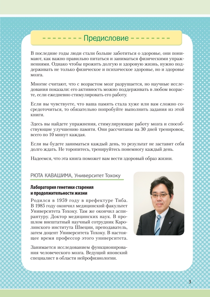 Очень важно сохранить ясность ума и остроту памяти на долгие годы! Добро пожаловать в мир научно обоснованных тренировок для вашего мозга! Книга профессора Рюты Кавашимы, ведущего японского специалиста в области нейрофизиологии, предлагает уникальную 30-дневную программу для улучшения работы мозга. Всего 10 минут в день — и вы заметите, как улучшается ваша память, концентрация и общая умственная активность.