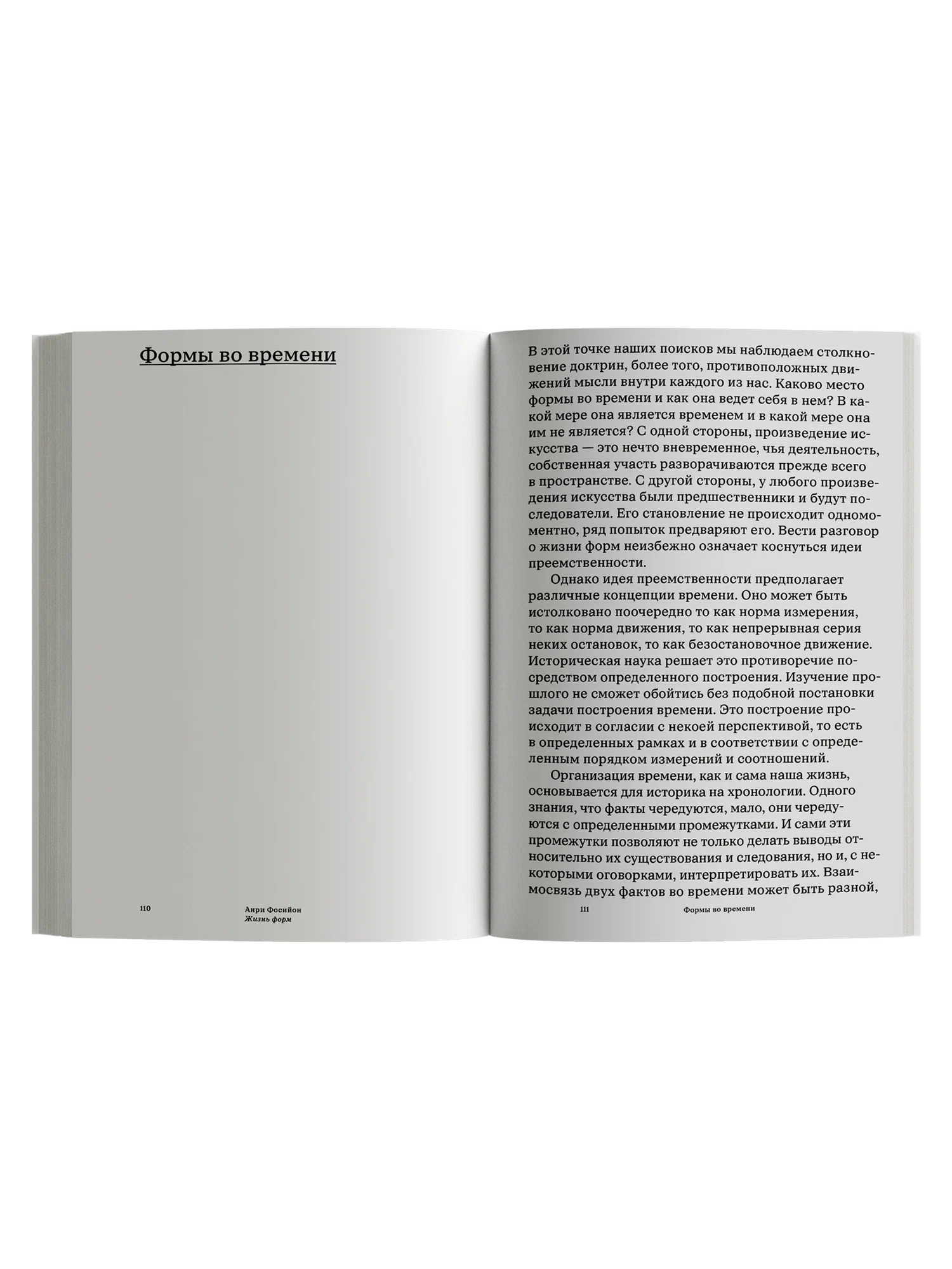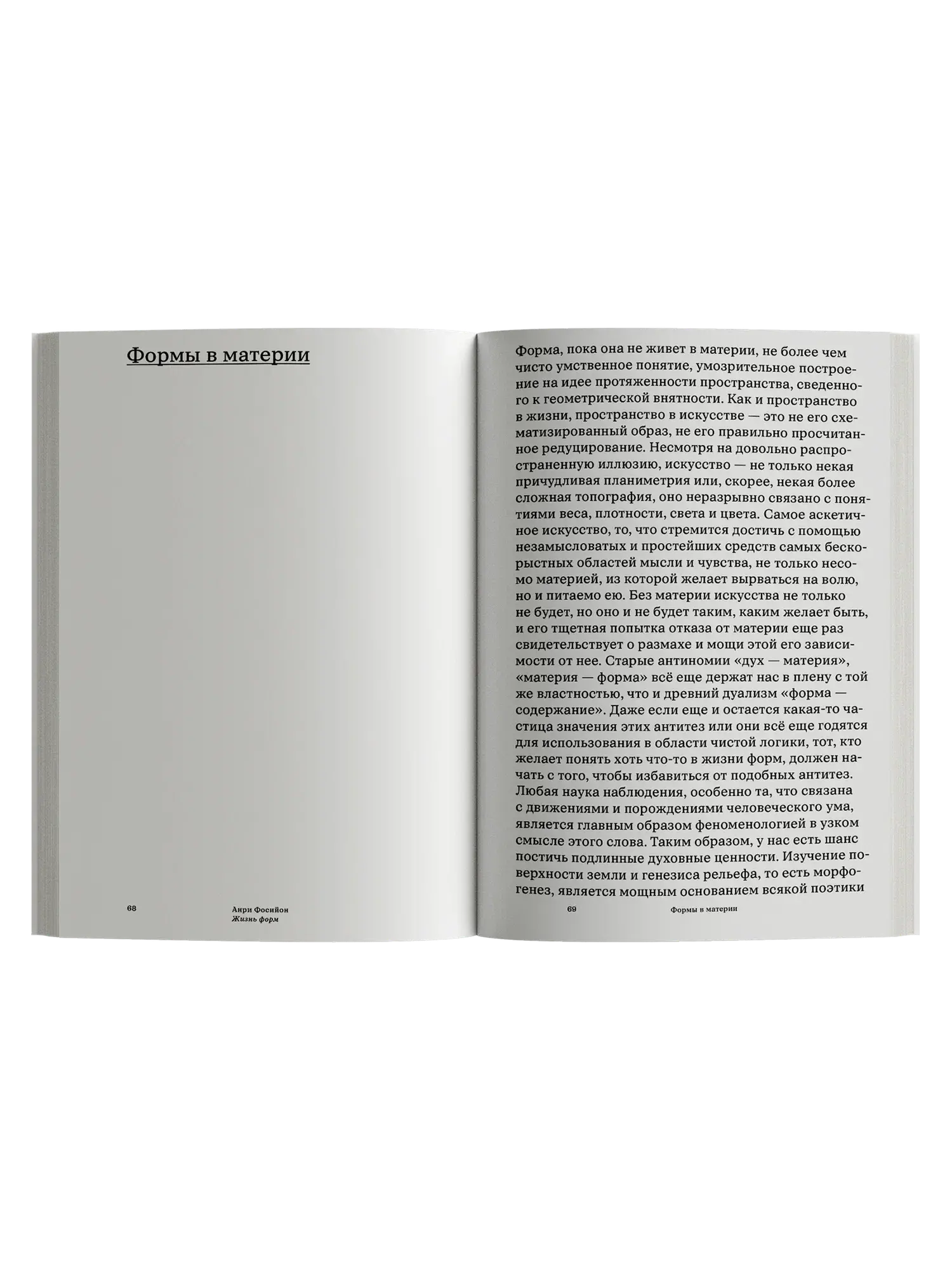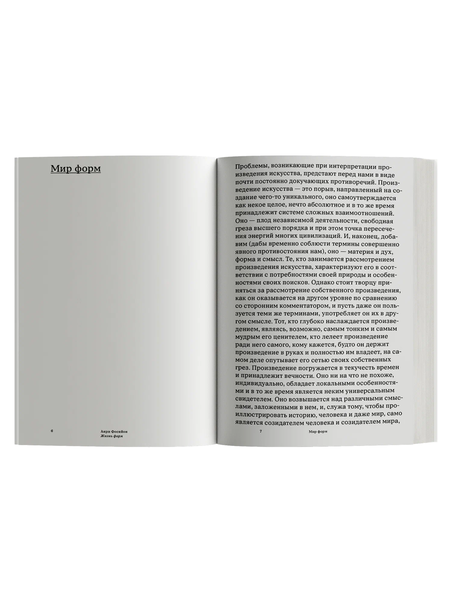 Книга классика французской и американской традиций истории искусства Анри Фосийона (1881–1943) «Жизнь форм» (1934) является квинтэссенцией его теории формы. Художественная форма представляется Фосийону не знаком и не идеей, а живым метаморфозом в пространстве, материи, сознании и времени, — и составляет «смыслы, исходящие от нее самой». Продолжая идеи немецких формалистов (Вёльфлин, Гильдебранд) и вдохновляясь бергсоновским витализмом, автор рассматривает жизнь художественных форм в тройном цикле: эксперименты (пробы), «классический» баланс (которому иногда на смену приходит рафинированность) и «барочный» распад. Эта формальная жизнь, по мнению Фосийона, «порождает новые условия для исторической, социальной и нравственной жизни» человека. Такой подход позволяет также избавить понятия стиля, материалов и техник в искусстве от присущей им часто инертности и увидеть их активный, созидательный или разрушительный, потенциал.