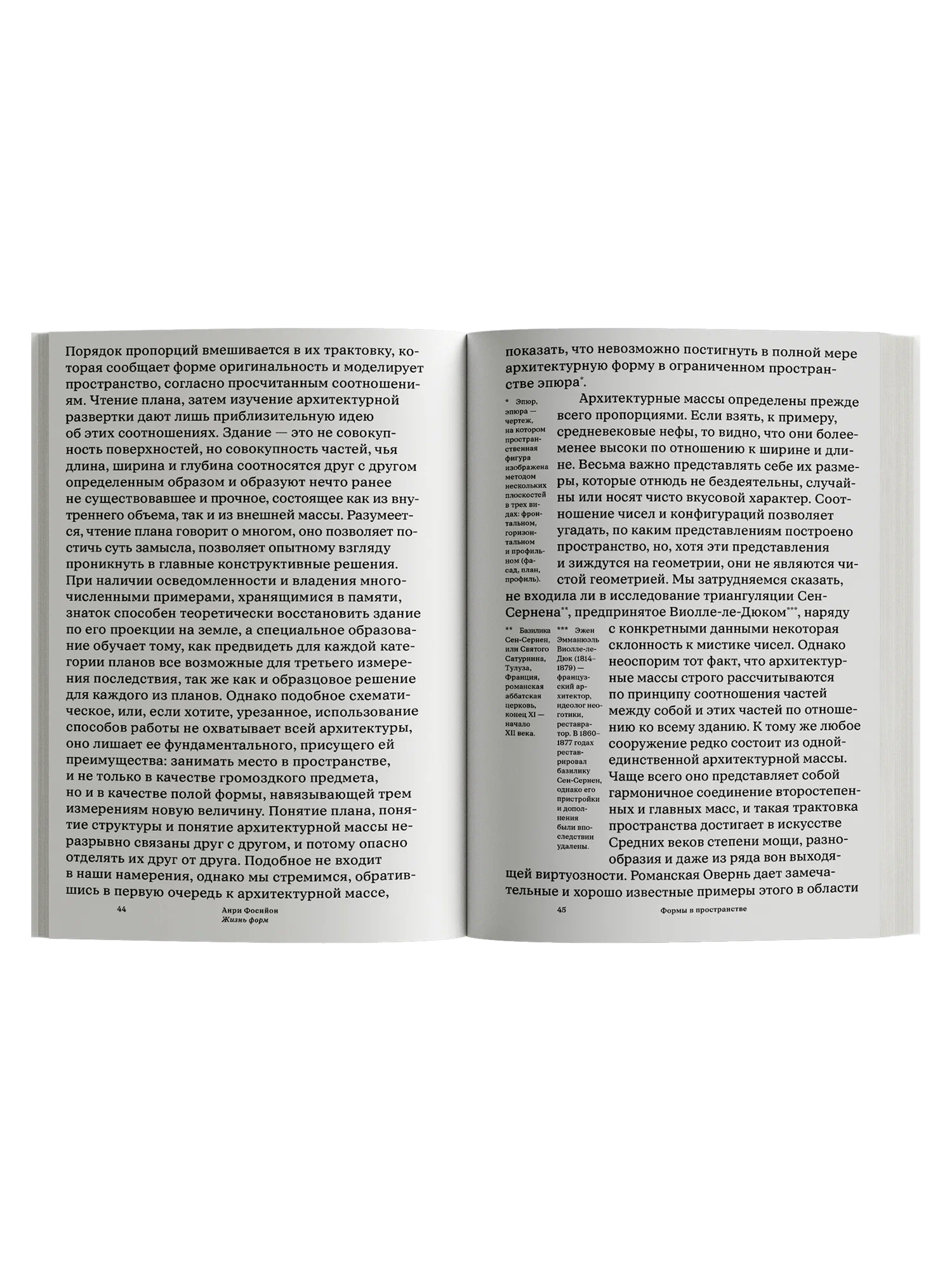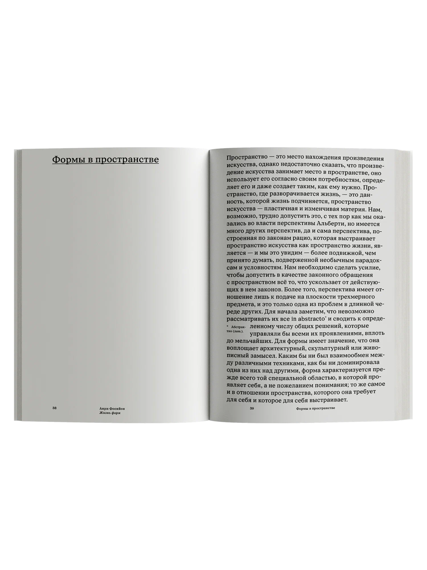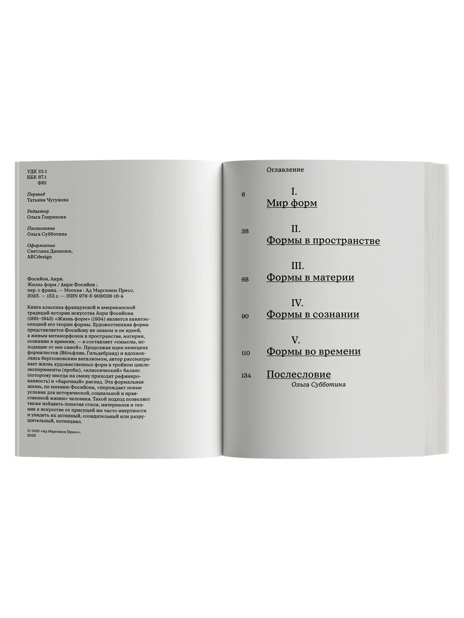 Книга классика французской и американской традиций истории искусства Анри Фосийона (1881–1943) «Жизнь форм» (1934) является квинтэссенцией его теории формы. Художественная форма представляется Фосийону не знаком и не идеей, а живым метаморфозом в пространстве, материи, сознании и времени, — и составляет «смыслы, исходящие от нее самой». Продолжая идеи немецких формалистов (Вёльфлин, Гильдебранд) и вдохновляясь бергсоновским витализмом, автор рассматривает жизнь художественных форм в тройном цикле: эксперименты (пробы), «классический» баланс (которому иногда на смену приходит рафинированность) и «барочный» распад. Эта формальная жизнь, по мнению Фосийона, «порождает новые условия для исторической, социальной и нравственной жизни» человека. Такой подход позволяет также избавить понятия стиля, материалов и техник в искусстве от присущей им часто инертности и увидеть их активный, созидательный или разрушительный, потенциал.