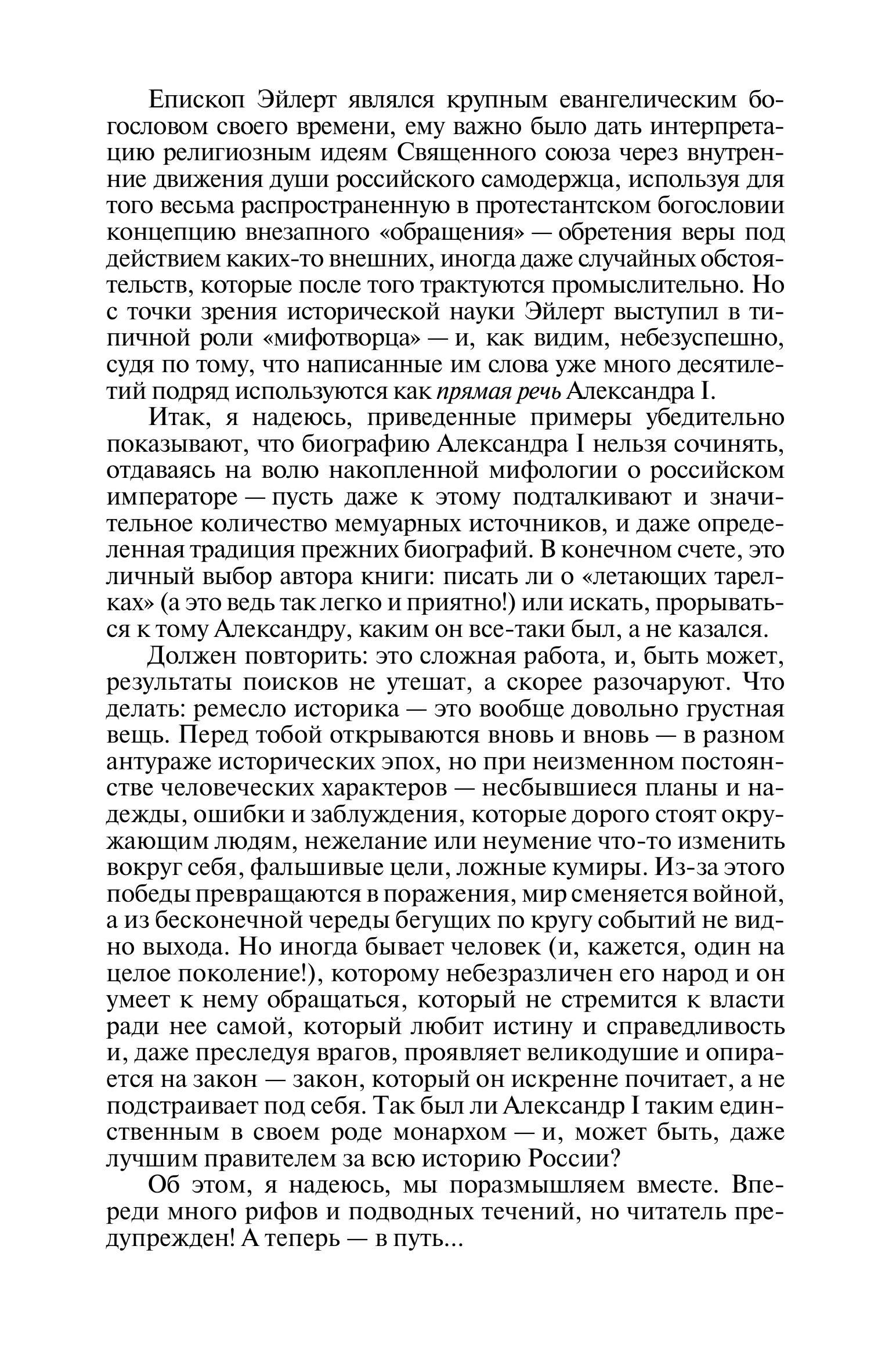 Биография впервые демонстрирует читателю как глубину провозглашаемых политических идей, так и скрытую от людей эмоциональную картину душевных переживаний Александра I, представляя личность русского царя со всеми его надеждами и разочарованиями, успехами и неудачами, что позволяет поставить множество вопросов, актуальных для русского исторического сознания.